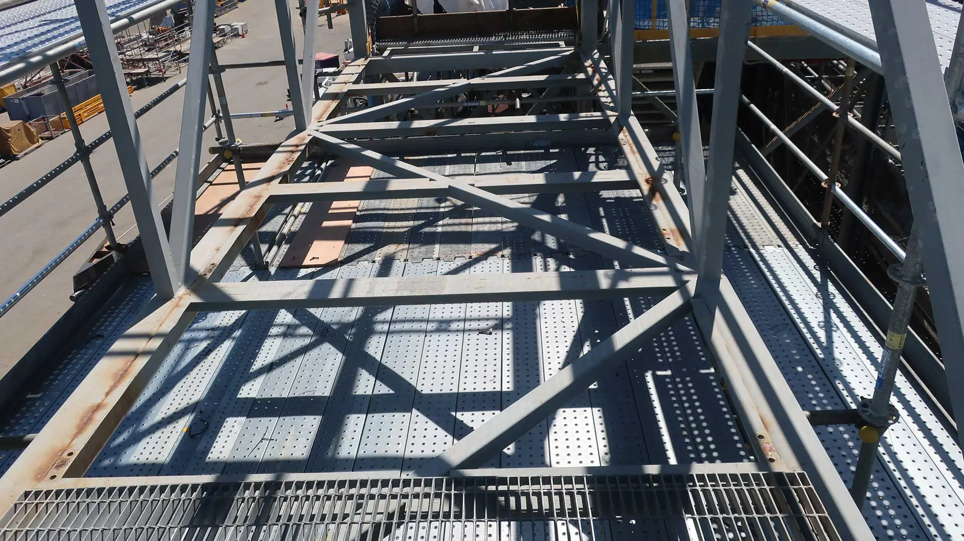The scope included complete scaffolding of the structure, removal of electrics, handrails and grid mesh, and structural repairs to primary members and mesh supports. Our team also engineered a non-welded dropped object screen compliant with AS 1657-2018 Clause 4.5, and carried out repairs to damaged handrail sections.