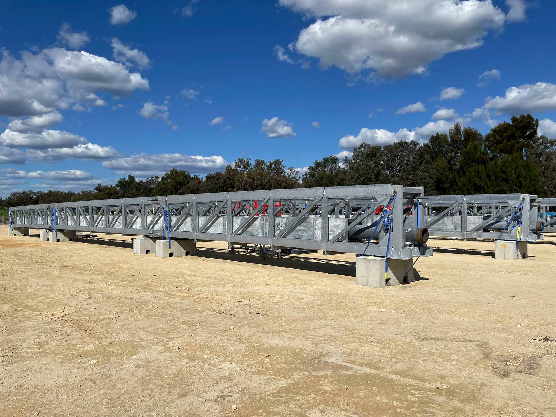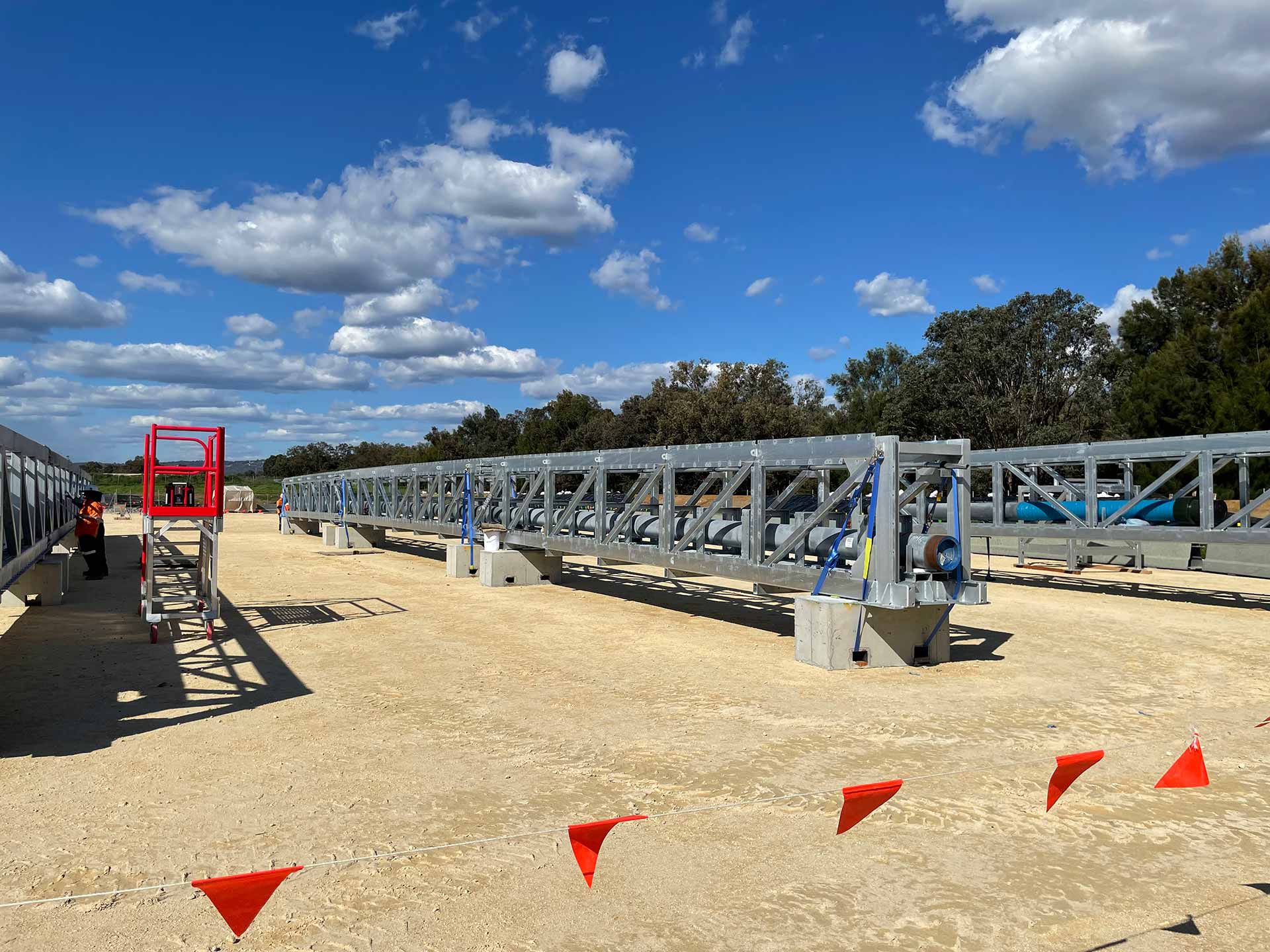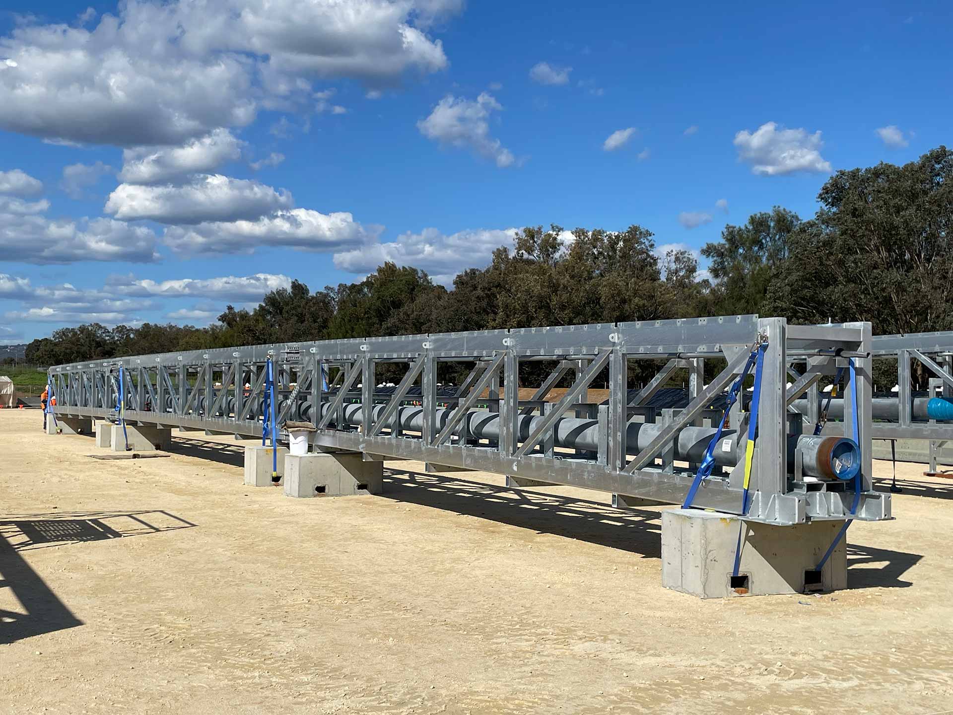 The works involved assembly of 11 prefabricated lattice truss sections, installation of 125 metres of 12” pipeline, and construction of both an anti-vandal pipeline enclosure and anti-throw protection screens. During delivery, our team re-engineered the floor plate installation methodology to eliminate hot works, improving safety and efficiency on site.