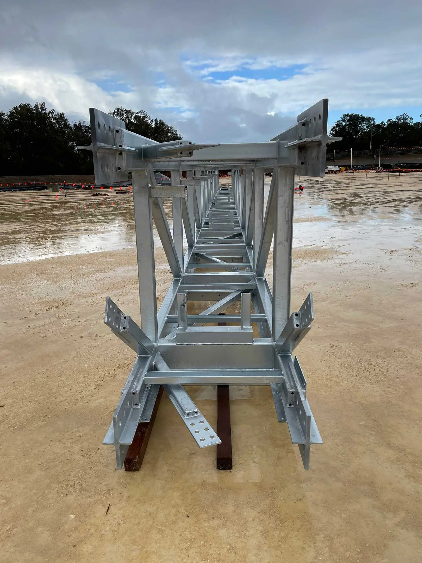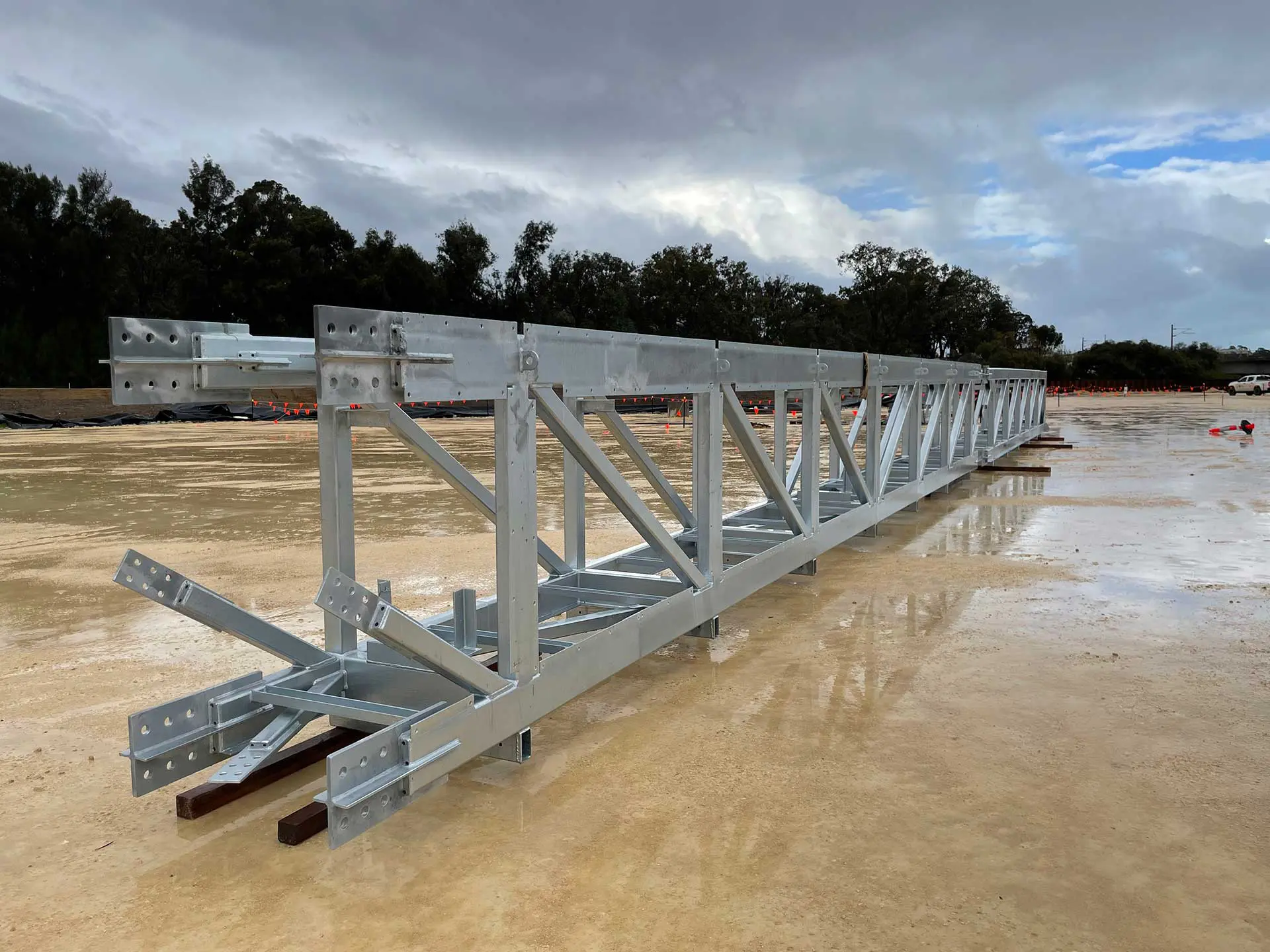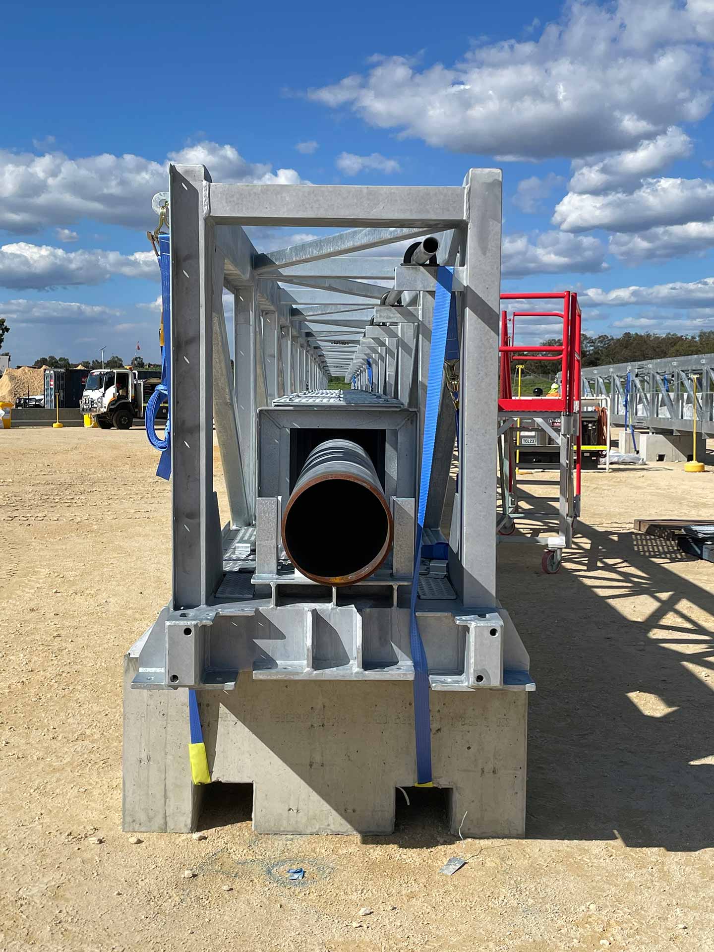 The works involved assembly of 11 prefabricated lattice truss sections, installation of 125 metres of 12” pipeline, and construction of both an anti-vandal pipeline enclosure and anti-throw protection screens. During delivery, our team re-engineered the floor plate installation methodology to eliminate hot works, improving safety and efficiency on site.